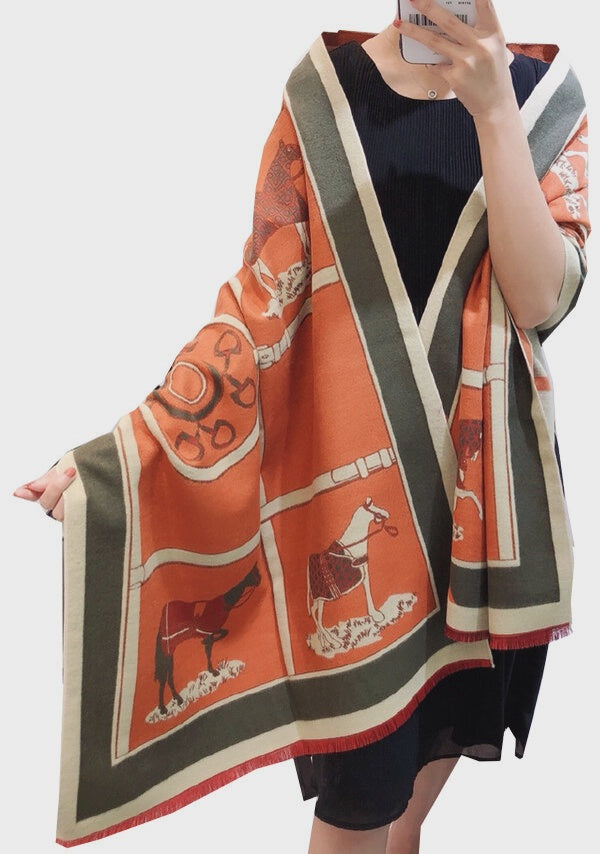 Enjoy this Equestrian Style Fashion wrap in elegant orange & cream, reversible scarf. Inspired by Hermes elegance, this soft, cashmere-like layering piece accents any outfit with a classic horse motif style.