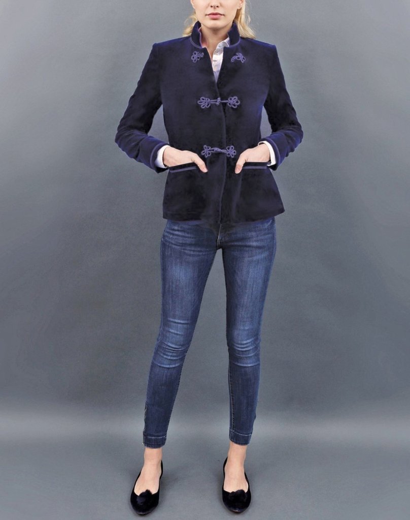 Feel amazing in this soft Italian Velvet Jacket Lina made for Saratoga Saddlery by Von Dornberg in Munich. This exclusive design features the indulgent Italian Velvet in midnight blue, Italian cotton velvet with navy borders and passament closures and the inside collar is from pure purple silk.
