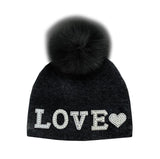 KNIT "LOVE" HAT WITH PEARLS & FOX FUR POMPOM