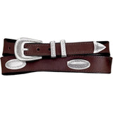 This belt features handsomely engraved, silver-plated ovals, a tip, and a buckle. A double keeper keeps everything in its place.