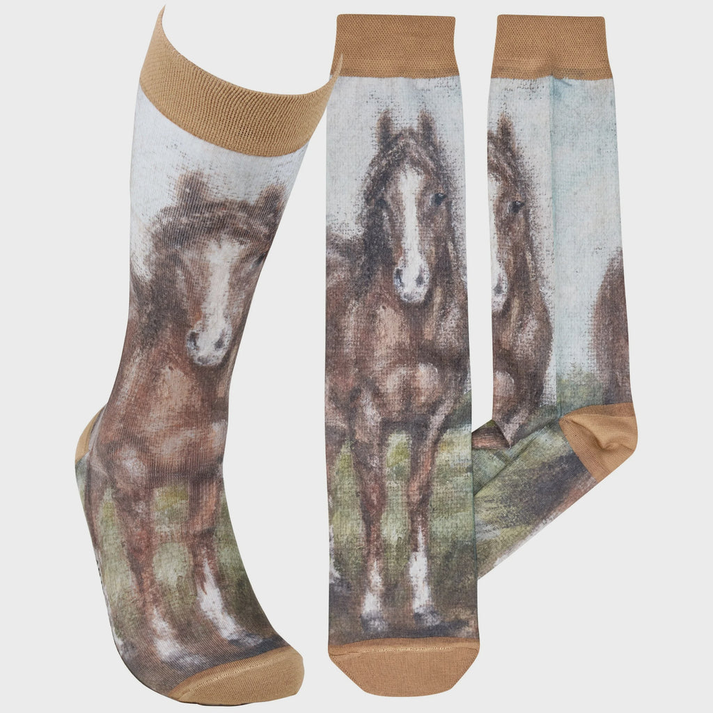 A pair of colorful knee-high socks from our Farmhouse Collection displaying a hand painted design of a brown horse on each sock. Design is digitally printed and replicated from original artwork painted onto burlap canvas, giving the art a unique depth and texture. Socks feature a knee-high length to easily show off the full design. Our knee-high Horse socks come with a header card and a clear plastic hanger for display. A charming farm-themed gift perfect for everyday self-expression.